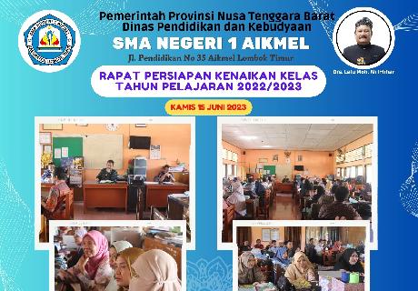 SMAN 1 Aikmel-Pada hari Kamis 15 Juni 2023 SMAN 1 Aikmel melaksanakan rapat Penetapan Kenaikan Kelas X dan XI Tahun Pelajaran 2022/2023 di ruang guru yang dipimpin langsung oleh Kepala SMAN 1 Aikmel Drs Lalu Moh Ali Iftihar bersama Dewan Guru dan Kasubag TU. Dalam kata sambutannya Kepala Sekolah menyampaikan ucapan terima kasih atas kehadiran bapak ibu guru serta Kepala Tata Usaha SMAN 1 ...