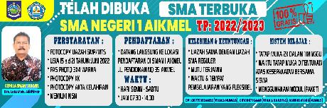 SMAN 1 AIKMEL - SMA Terbuka merupakan program yang dihajatkan untuk memberikan kemudahan memperoleh pendidikan SMA secara gratis tanpa dipungut biaya dan legalitas ijazah kepada siswa yang tidak bisa secara reguler masuk ke jenjang SMA. Program SMA Terbuka merupakan program bidang Pengembangan SMA Dikbud NTB yang diharapkan mampu memberikan layanan pendidikan dengan segala kemudahan...