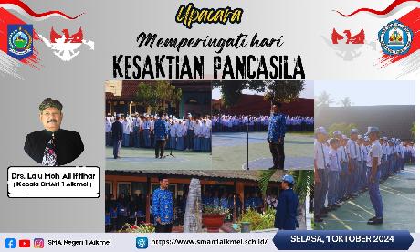 SMA Negeri 1 Aikmel-Pada hari Selasa, 1 Oktober 2024 SMA Negeri 1 Aikmel menggelar upacara bendera dalam rangka memperingati Hari Kesaktian Pancasila. Upacara ini berlangsung khidmat di lapangan sekolah dengan dihadiri oleh seluruh siswa, guru, dan staf Tata Usaha. Bertindak sebagai pembina upacara adalah Kepala SMA Negeri 1 Aikmel, Bapak Drs. Lalu Moh Ali Iftihar. Upacara dimulai tepat pukul 07....