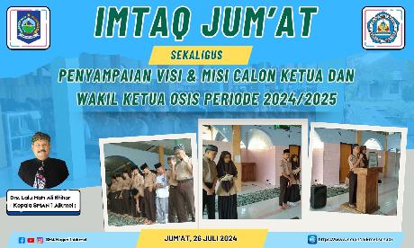 Aikmel, 26 Juli 2024 – Kampanye calon ketua dan wakil ketua OSIS SMA Negeri 1 Aikmel untuk periode 2024/2025 berlangsung dengan meriah di Musolla Sekolah pada hari Jumat, 26 Juli 2024 yang dirangkaikan dengan kegiatan Imtaq pagi. Acara ini dihadiri oleh seluruh siswa, guru, dan staf TU yang antusias menyaksikan dan mendukung para kandidat. Sejumlah kandidat tampil percaya diri memperken...
